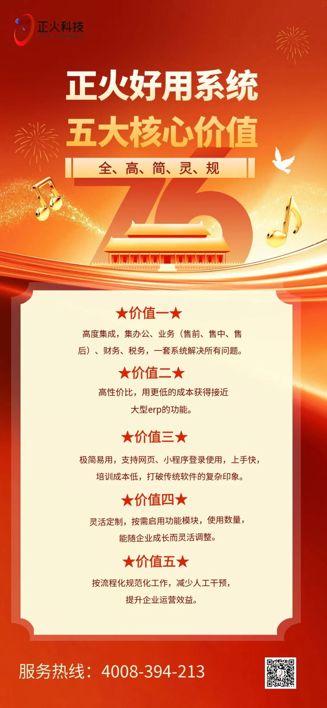 值此国庆佳节,举国欢庆之际,正火科技作为专注于电器暖通工程行业23年管理系统研发与服务的企业,始终坚守服务一线,以稳定、高效的数字化解决方案,为家电门店、综合卖场、暖通工程、服务网点、品牌厂家提供集客户关系、进销存、售后服务、财务会计、线上商城于一体的信息化数字化一站式解决方案!为广大客户的国庆销售旺季保驾护航,与广大客户共庆祖国76周岁华诞!
